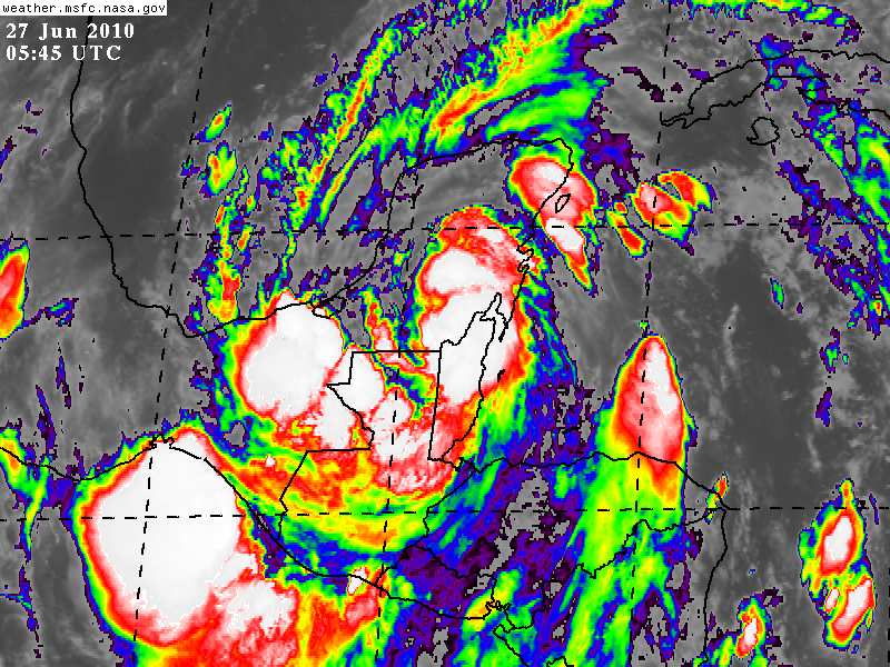 Alex desplazandose de acuerdo a los pronósticos sobre tierra, con vientos de 65Km/h, continúa como una Tormenta Tropical, pero está próxima a convertirse en una Depresión Tropical nuevamente.