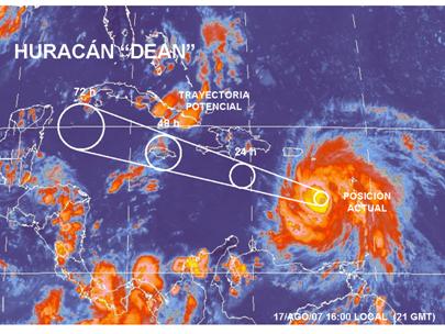 El Huracán "Dean" avanza rapidamente hacia el Oeste con rumbo posiblemente hacia la Peninsula de Yucatán, estableciendo una Alerta Preventiva para la misma, se mantiene en estrecha vigilancia por su trayectoria probable. Se recomienda a la población mantenerse informada de la trayectoria futura de este fenómeno. Estados de posible afectación: Yucatán y Quintana Roo.