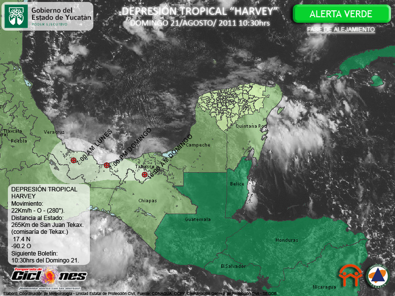 En congruencia con lo anticipado, la Tormenta Tropical Harvey se debilita al interactuar con zonas montañosas, ahora es una Depresión Tropical con vientos sostenidos de 45Km/h, los cuales se concentran muy próximos a su centro.