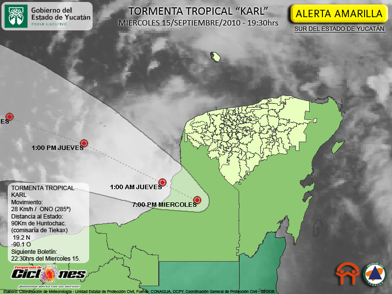 Se ha hecho de Conocimiento de las Autoridades Municipales de nuestra entidad de las potenciales afectaciones derivadas de la Tormenta Tropical KARL, especialmente debido a las intensas lluvias esperadas. La Unidad Estatal de Protección Civil y Secretaría de Seguridad Pública realizan recorridos en el Sur de nuestro Estado en coordinación con las Autoridades Municipales correspondientes, especialmente en aquellas con potencial de encharcamientos. Hasta el momento, las comunidades se reportan sin Unidad.