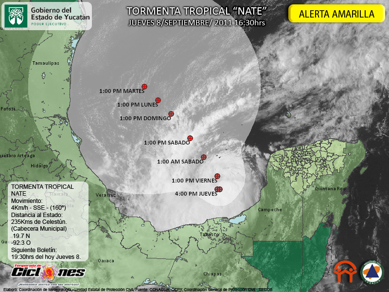 El Centro de la Tormenta Tropical Nate se estima esta tarde a 125Km al Nor-Noroeste de Ciudad del Carmen Campeche, 235Kms de Celestún, Yucatán, sin embargo, vientos de Tormenta Tropical se extienden hasta 85Kms al Noreste de su centro, cuadrante correspondiente a nuestra entidad, por lo que vientos de Tormenta Tropical son estimados a 150Kms de Celestún.