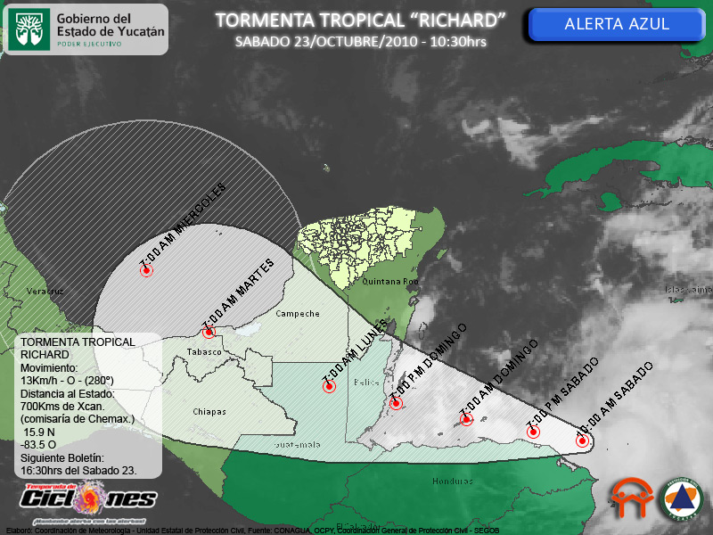 En el escenario presentado a las 10:00hrs, se espera que el Centro de la Tormenta Tropical se aproxime a la Costa Norte de Honduras el día de hoy, para posteriormente desplazarse sobre tierra en territorio de Belice el día Domingo al anochecer.