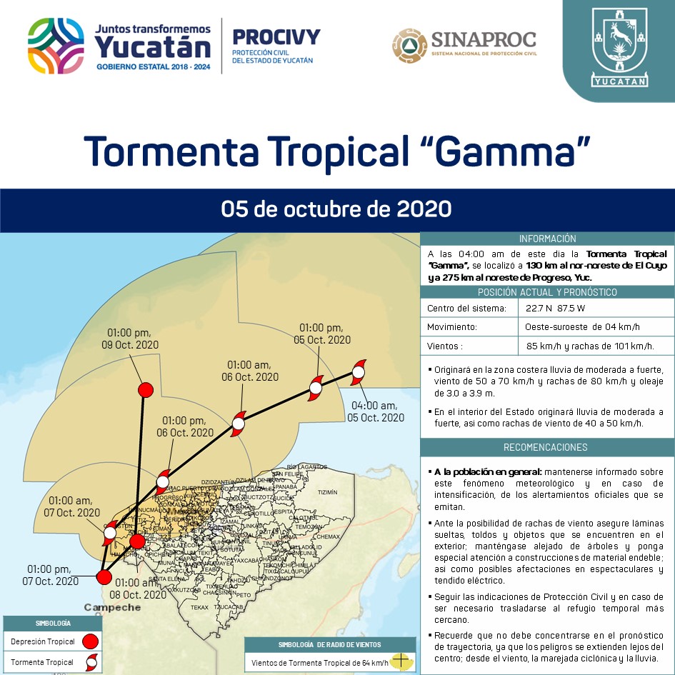 La Tormenta Tropical Gamma, se localiza a 130 km al nor-noreste de El Cuyo y a 275 km al noreste de Progreso, Yucatán.