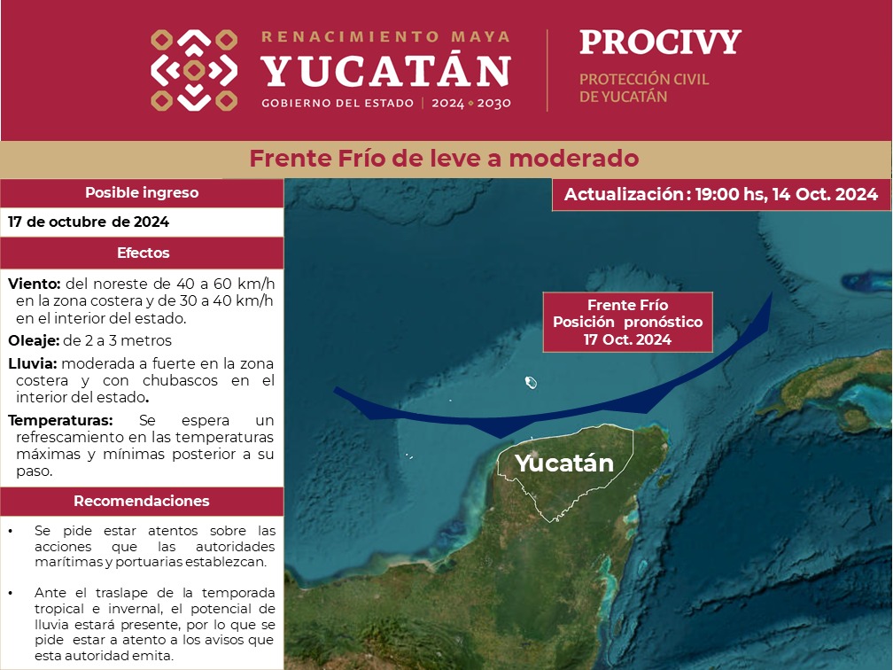 Se informa que continua vigente del ingreso de un Frente Frío hacia el Estado de Yucatán el 17 de octubre de 2024; el cual originará evento norte moderado, con rachas de viento de 40 km/h a 60 km/h en la Zona Costera y de 30 km/h a 40 km/h en el interior del Estado, oleaje de 2 a 3 metros, lluvia moderada a fuerte en la Zona Costera y con chubascos en el interior del Estado.