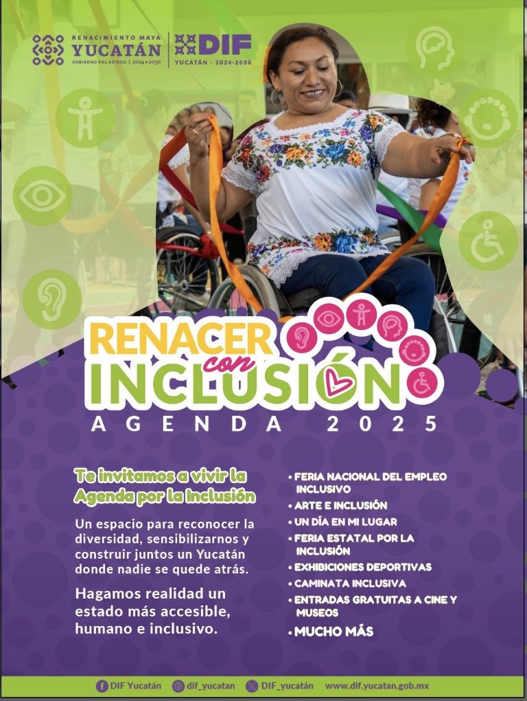 Con el propósito de fortalecer una cultura de respeto, accesibilidad y participación plena de las personas con discapacidad, el Gobierno del Estado de Yucatán y el Sistema para el Desarrollo Integral de la Familia (DIF) Yucatán dieron a conocer la Agenda "Renacer con Inclusión 2025", un programa de actividades que se desarrollará del 26 de noviembre al 7 de diciembre y que reúne a dependencias estatales, instituciones educativas, asociaciones civiles y sector privado bajo una misma visión de igualdad y justicia social.