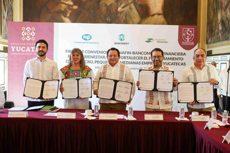"Gracias al convenio que hoy firmamos, contaremos con una bolsa inicial de 254 millones de pesos, derivada de la aportación estatal y la multiplicación de recursos por parte de NAFIN. Esto generará un efecto multiplicador en nuestra economía local, beneficiando a miles de familias yucatecas, ya que las Mipymes podrán acceder a créditos de hasta 5 millones de pesos. Por su parte, Bancomext destinará hasta 2,000 millones de pesos para financiar naves industriales y proyectos de gran turismo", señaló.
