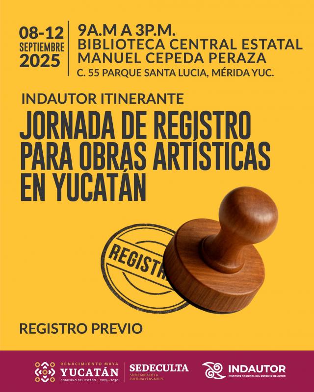 Con el propósito de salvaguardar los derechos de autor de la comunidad creativa de Yucatán y estados vecinos, el Instituto Nacional del Derecho de Autor (Indautor), en colaboración con la Secretaría de Cultura y las Artes (Sedeculta), realizará una jornada de registro de obra en modalidad express.