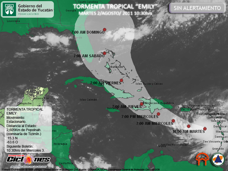 Ayer por la Tarde se formó en el Mar Caribe la Tormenta Tropical EMILY, la cual se encuentra esta mañana a 2,605Km de Popolnah, (Comisaría de Tizimin, Yucatán) y a 435Km al Sureste de San Juan Puerto Rico.