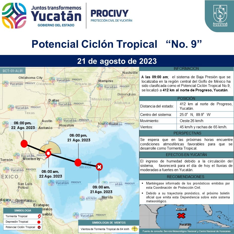 Potencial Ciclón Tropical No.9; se encuentra a 412 km al norte de Progreso, #Yucatán, se mueve al Oeste a una velocidad de 26 km/h con vientos de 45 km/h y rachas de 65 km/h.