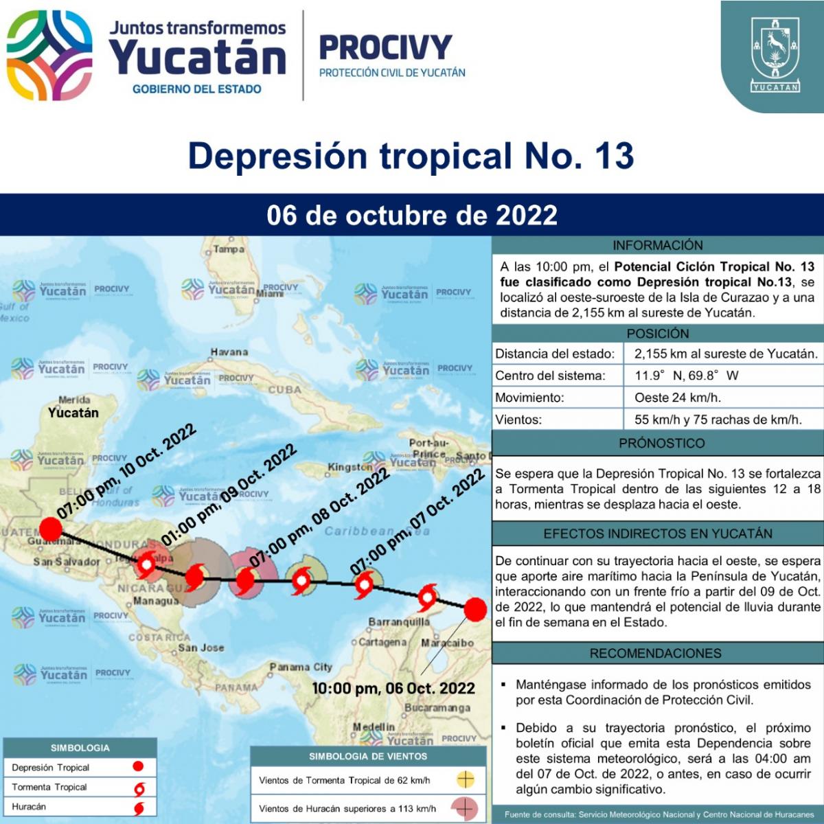 A las 10:00 pm, el Potencial Ciclón Tropical No. 13 fue clasificado como Depresión Tropical No.13, se localizó al oeste-suroeste de la Isla de Curazao.