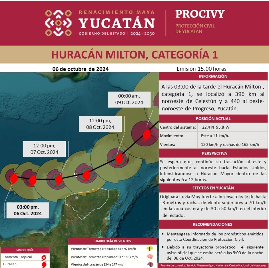 A las 03:00 de la tarde el Huracán Milton, categoría 1, se localizó a 396 km al noroeste de Celestún.