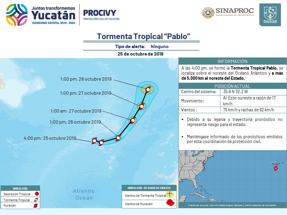 Se formó la Tormenta Tropical "Pablo" sobre el noreste del Océano Atlántico, se localiza a más de 5,000 km al noreste del estado y se mueve al sur-sureste a razón de 17 km/h; debido a su lejanía y trayectoria pronóstico no representa riesgo para el Estado.