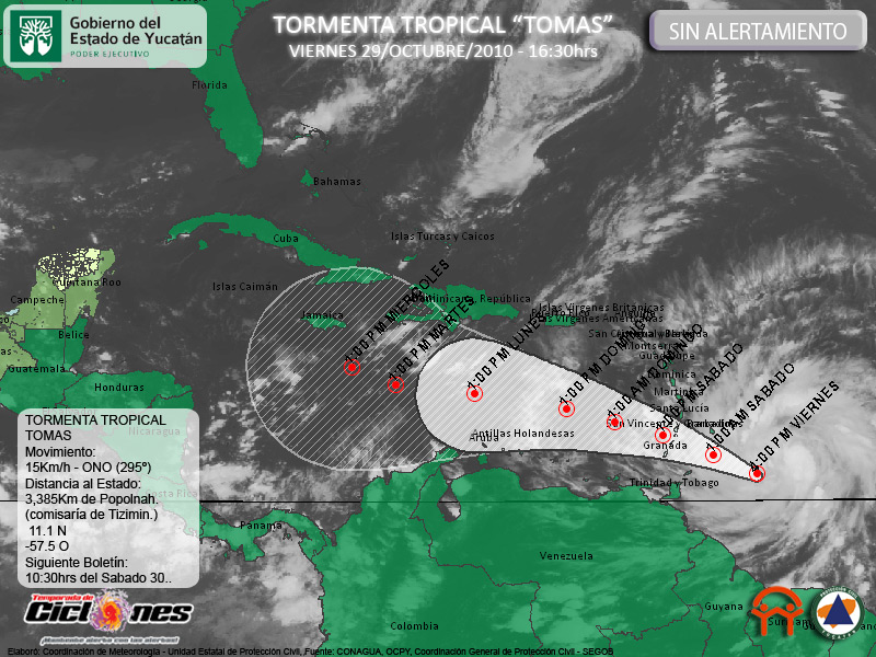 Al respecto en estos momentos no hay Alertamiento por la Tormenta Tropical Tomas, para el Estado de Yucatán, sin embargo esta situación podría cambiar durante el inicio de semana, dependiendo del comportamiento de dicho sistema durante los próximos días.