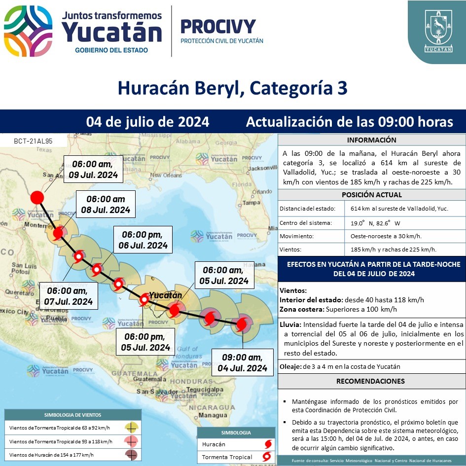Huracán Beryl. se encuentra a 614 kilómetros de Yucatán.