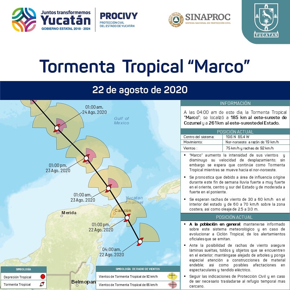 La Tormenta Tropical Marco, se localiza a 261 km al sur-sureste de #Yucatán; se mueve hacia el nor- noroeste a una velocidad de 19 km/h con vientos de 75 km/h y rachas de 92 Km/h.
