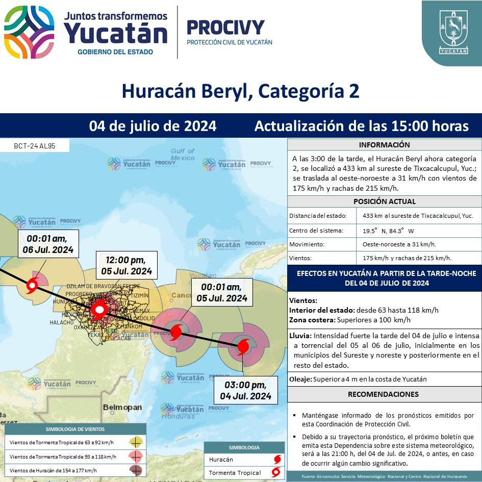 A las 3:00 de la tarde, el Huracán Beryl ahora categoría 2, se localizó a 433 km al sureste de Tixcacalcupul, Yucatán.