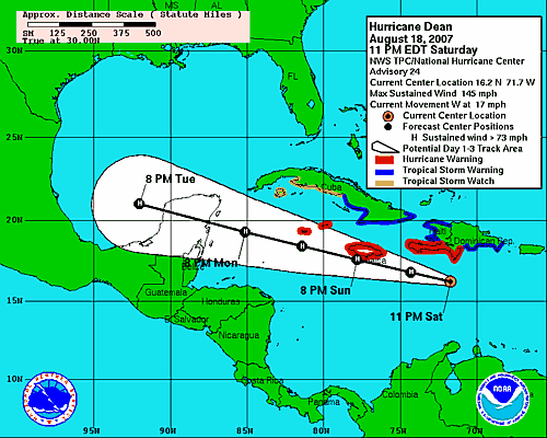 El Peligroso Huracán "Dean" avanza rapidamente hacia el Oeste con rumbo posiblemente hacia la Peninsula de Yucatán, estableciendo una Alerta Preventiva para la misma, se mantiene en estrecha vigilancia por su trayectoria probable. Se recomienda a la población mantenerse informada de la trayectoria futura de este fenómeno e iniciar recomendaciones en caso de Huracán. Estados de posible afectación: Yucatán y Quintana Roo.