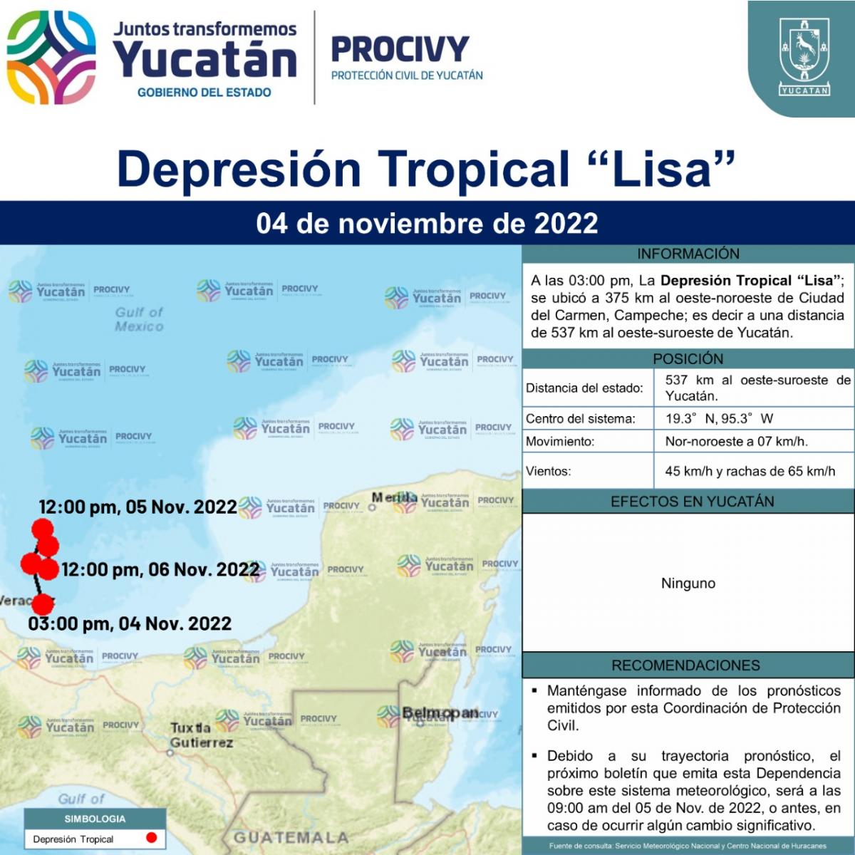 A las 03:00 pm, La Depresión Tropical "Lisa"; se ubicó a 375 km al oeste-noroeste de Ciudad del Carmen, Campeche.