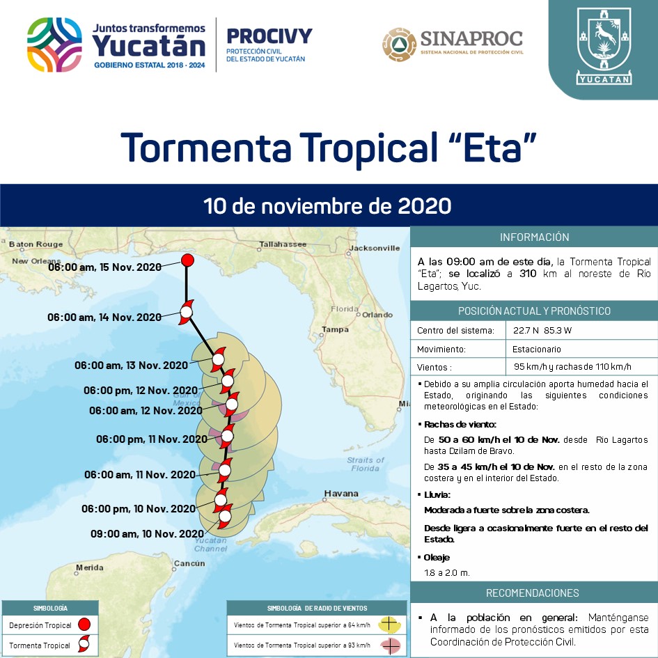 La Tormenta Tropical Eta; se localiza a 310 km al noreste de Río Lagartos, Yucatán.