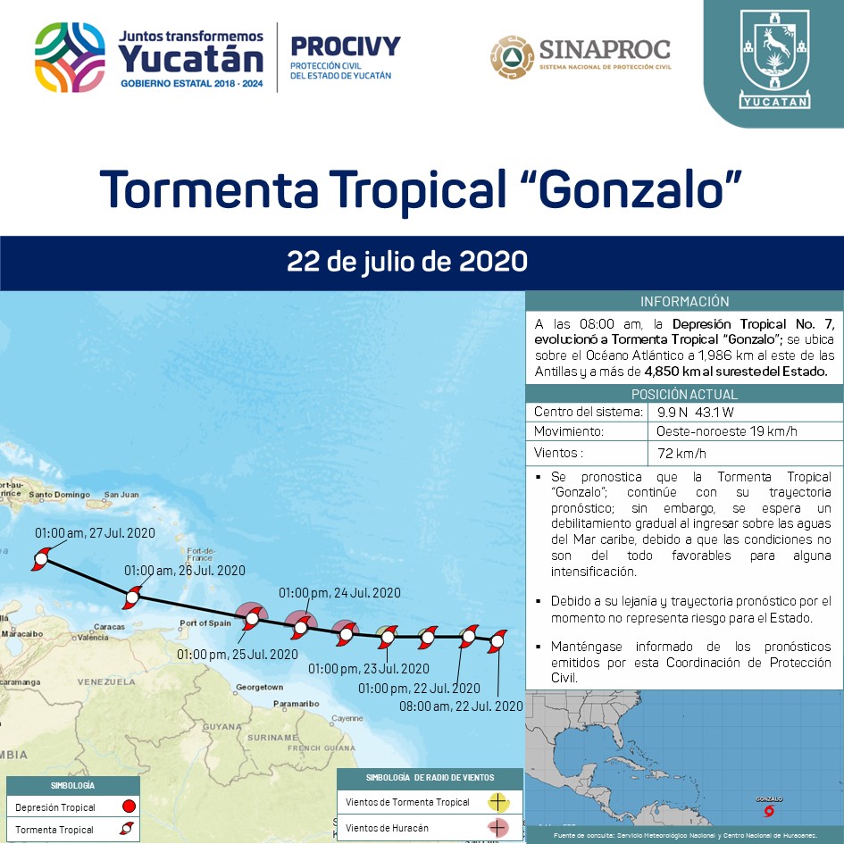 A las 08:00 am, la Depresión Tropical No. 7, evolucionó a Tormenta Tropical "Gonzalo"; se ubica sobre el Océano Atlántico a 1,986 km al este de las Antillas.
