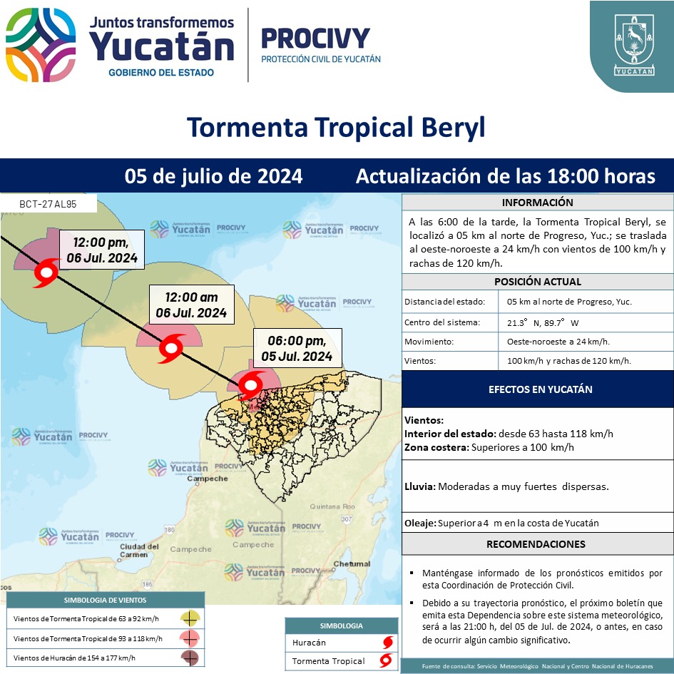A las 6:00 de la tarde, la Tormenta Tropical Beryl, se localizó a 05 km al norte de Progreso, Yucatán.