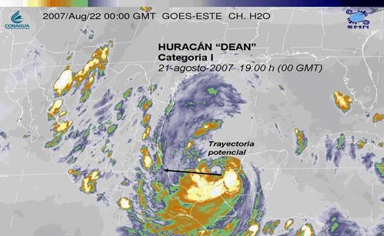 El Huracán Dean se encuantra en etapa de alejamiento de las peninsula de Yucatán. Pronóstico de desplazamiento y evolución para las 01:00 h local del día 22
