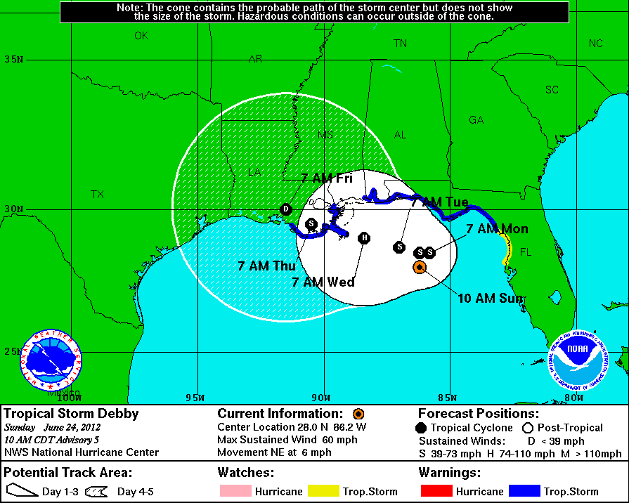 Las perspectivas implican que la Tormenta Tropical Debby continuará con un desplazamiento lento y posiblemente erratico durante las próximas horas sobre el Noreste del Golfo de México, sin embargo se espera un giro gradual hacia el Oeste durante las próximas 24hrs.