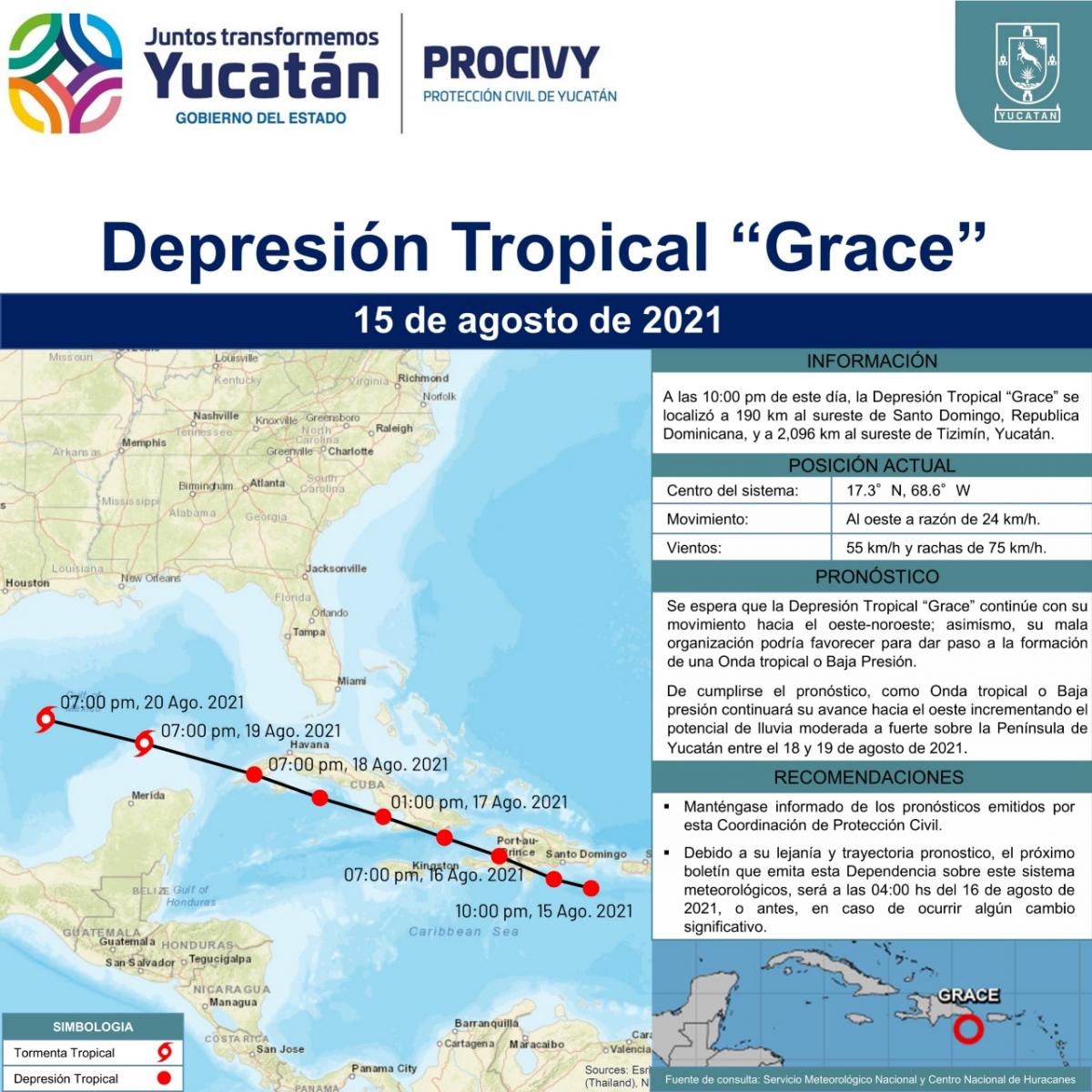 La Depresión Tropical Grace, se localiza a 190 km al sureste de Santo Domingo, República Dominicana.