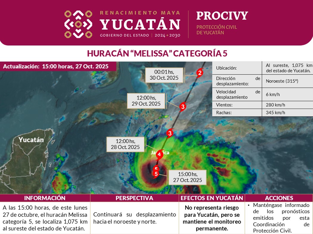Se espera que Melissa continue su desplazamiento hacia el noroeste en las próximas horas con trayectoria hacia Jamaica y con pronóstico de tocar tierra entre las 09:00 y 11:00 horas del martes 28 de octubre de 2025.