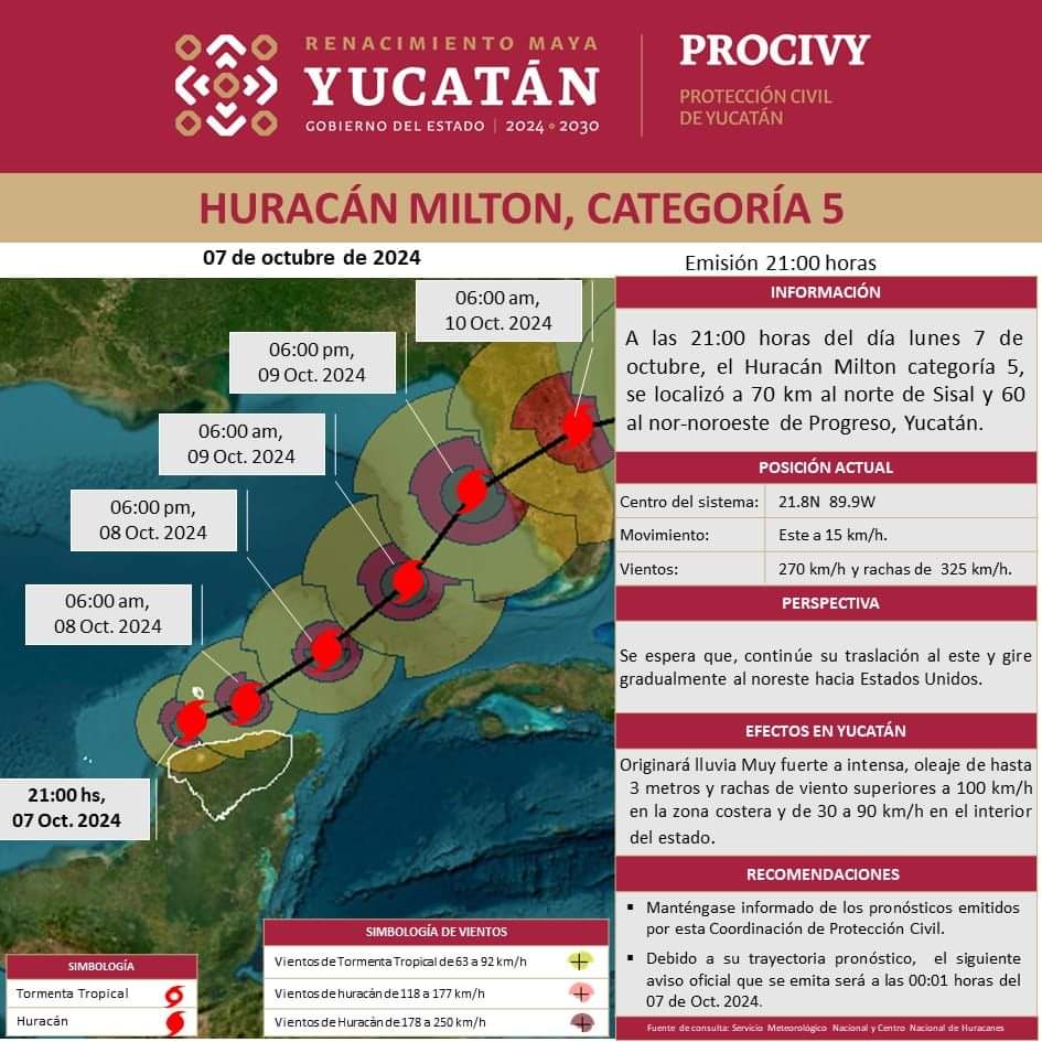 A las 21:00 horas de este lunes 7 de octubre, el Huracán Milton categoría 5, se localizó a 70 km al norte de Sisal y 60 km al nor-noroeste de Progreso, Yucatán.