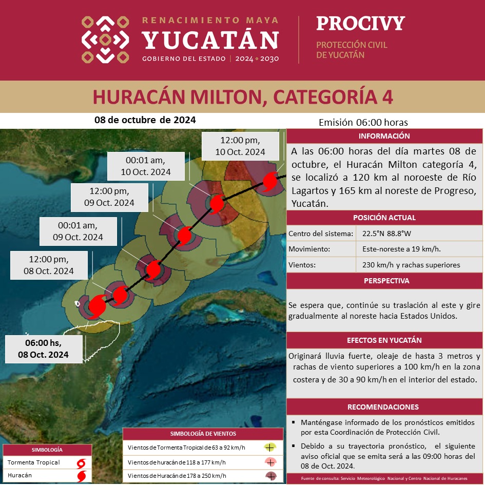 A las 06:00 horas de hoy martes 08 de octubre, el Huracán Milton categoría 4, se localizó a 120 km al noroeste de #RioLagartos y a 165 km al noreste de Progreso, Yucatán.