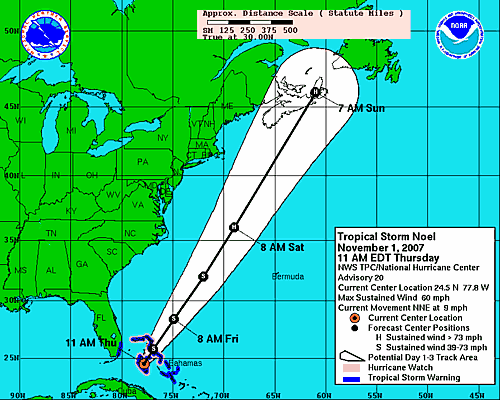 Noel continúa como Tormenta Tropical y mantiene su lento desplazamiento por las Bahamas pasando muy cerca de la Costa Este de Florida.