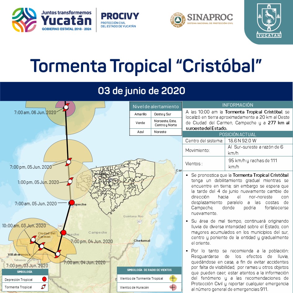 A las 10:00 pm la Tormenta Tropical Cristóbal, se localizó en tierra aproximadamente a 35 km al Sur de Ciudad del Carmen, Campeche y a 288 km al suroeste del Estado, presenta movimiento estacionario con vientos de 75 km/h y rachas de 92 km/h