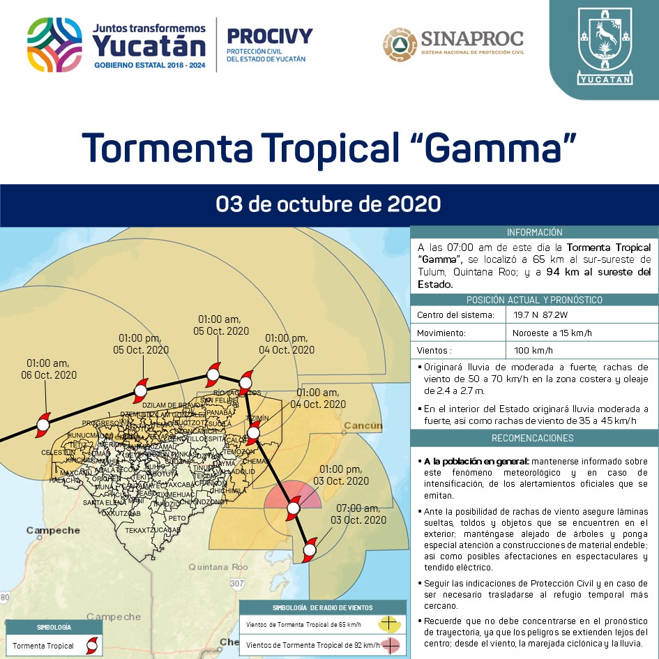 La Tormenta Tropical "Gamma", se localiza a 65 km al sur-sureste de Tulum, Quintana Roo y a 94 km al sureste de Yucatán.