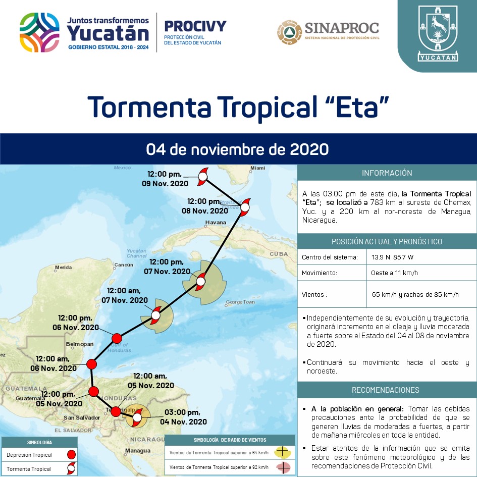 La Tormenta Tropical "Eta"; se localiza en tierra a 200 km al nor-noreste de Managua, Nicaragua.