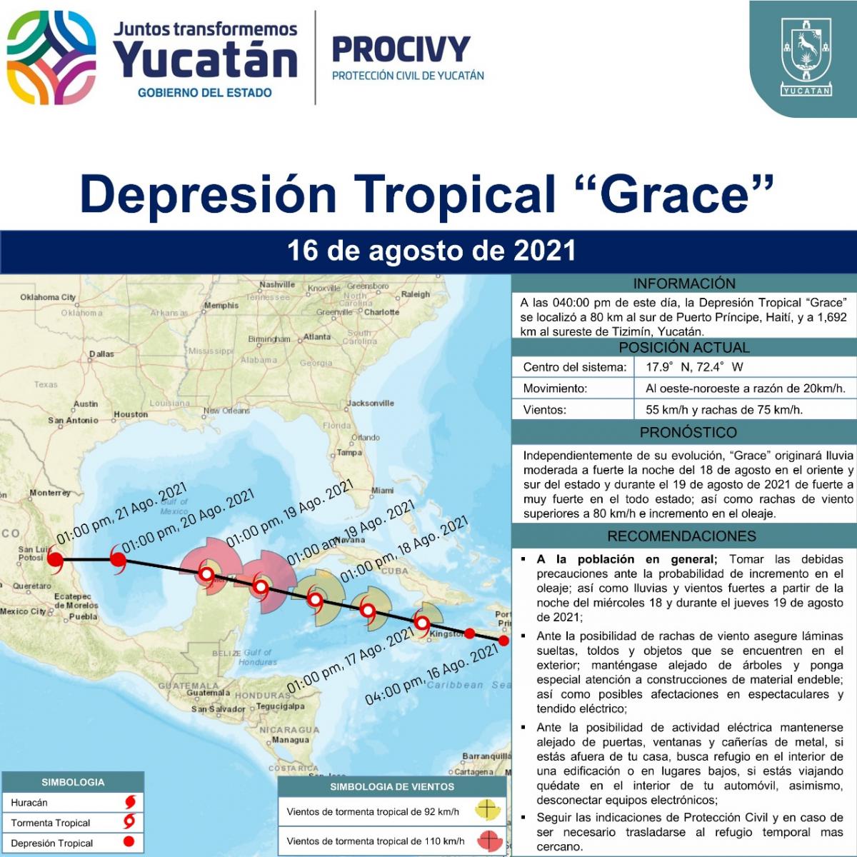 En Yucatán, se espera lluvia moderada a fuerte a partir de la noche del miércoles 18 de agosto en el oriente y sur; y fuerte a muy fuerte junto con incremento en el oleaje en la zona costera y rachas de viento superiores a los 80 km/h durante el jueves 19 en toda la entidad.