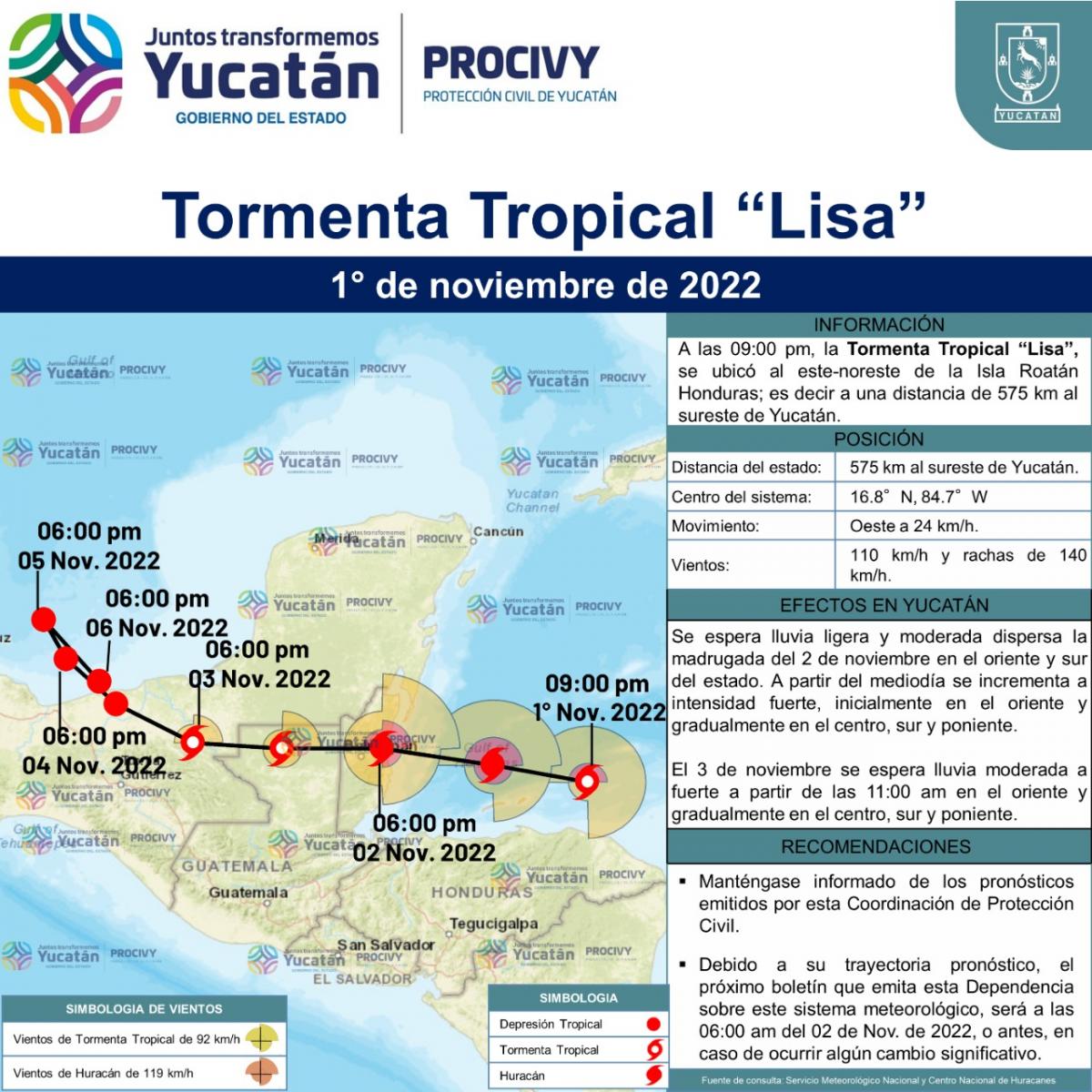 Se espera que la mañana del 3 de noviembre, el centro de la Tormenta Tropical, pase a una distancia de 239 km al sur del estado y a 391 km al sur de Mérida.