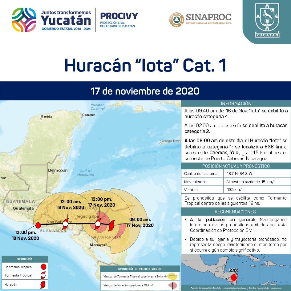 El Huracán Iota se debilitó a categoría 1; se localiza a 145 km al oeste-suroeste de Puerto Cabezas, Nicaragua.