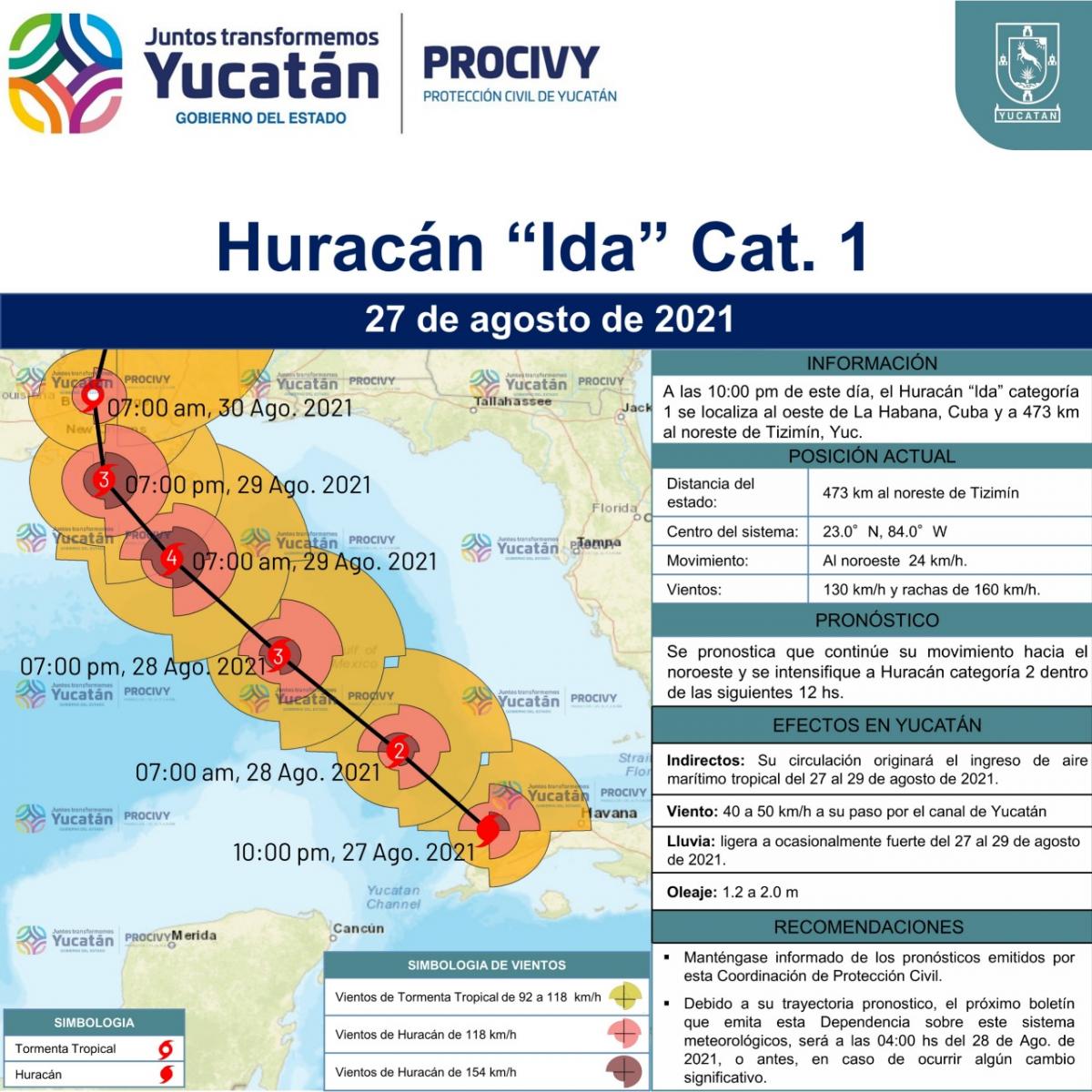 A las 10:00 pm de este día, el Huracán "Ida" categoría 1 se localiza al oeste de La Habana, Cuba y a 473 km al noreste de Tizimín, Yuc.; se mueve al noroeste a 24 km/h, con vientos de 130 km/h y rachas de 160 km/h.