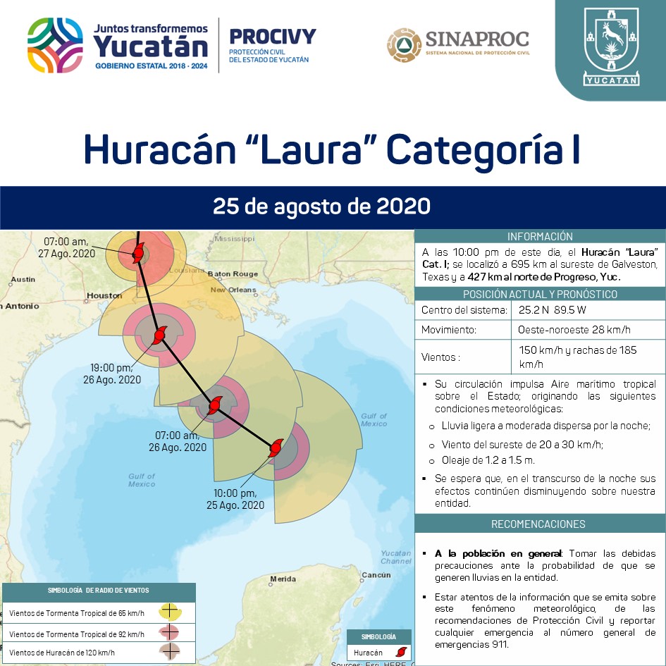 El Huracán #Laura Categoría 1, se localiza a 695 km al sureste de Galveston, Texas, E.U.A.