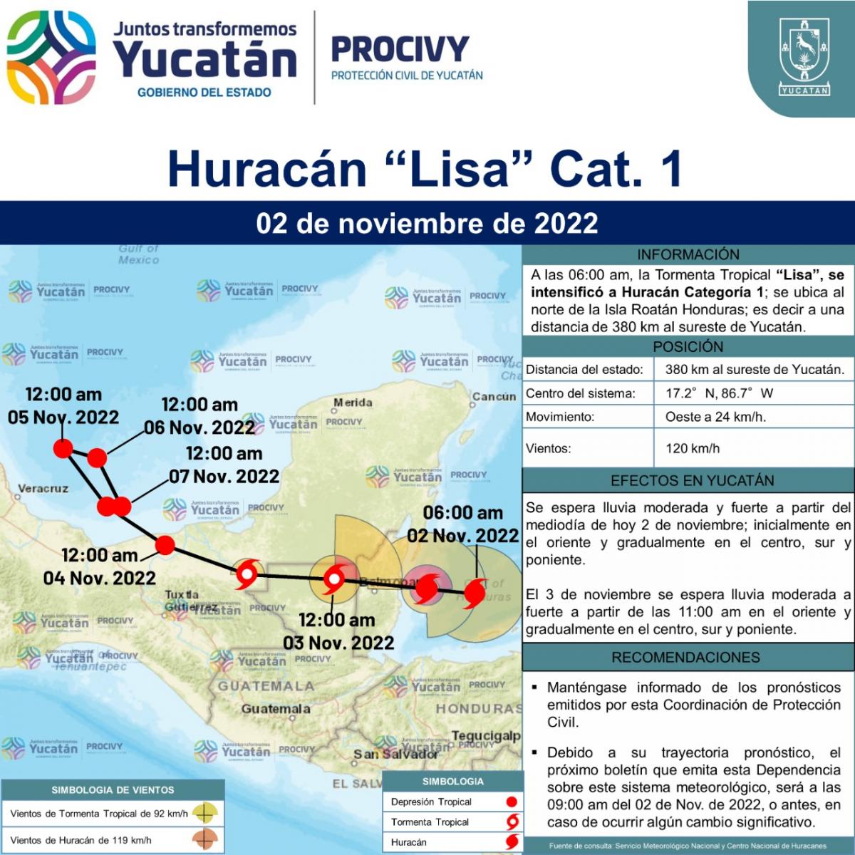 La Tormenta Tropical "Lisa", se intensificó a Huracán Categoría 1; se ubica al norte de la Isla Roatán en Honduras.