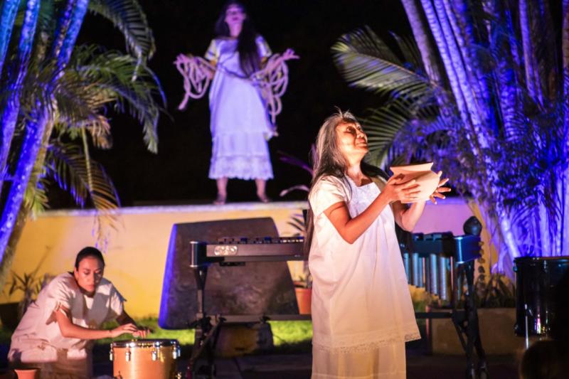 Sobre la obra, la actriz y dramaturga maya Socorro Loeza Flores explicó que el proyecto se basa en escritos antiguos como el Popol Vuh, los Cantares de Dzitbalché y relatos como La soga viva, La última agua del cenote y Las tres vírgenes.